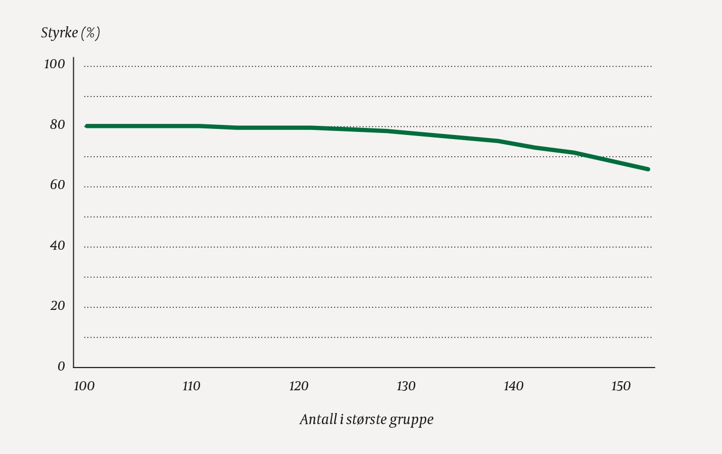 Vi har sett på to forskjellige situasjoner: Når det totale antallet i en studie er gitt, vil ikke styrken bli vesentlig redusert ved noe ubalanse i antallet mellom de to gruppene. Når antallet i den ene gruppen er begrenset, kan styrken økes vesentlig ved å øke antallet i den andre gruppen.