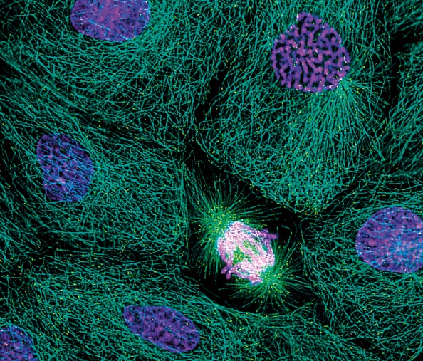Ved celledeling – mitose – organiseres DNA i tettpakkede kromatinstrukturer for å sikre overføring av arvematerialet. I en studie som nylig er publisert i tidsskriftet Science, ble såkalte DT40-celler fra kylling brukt for å studere denne prosessen (1) . Ved å hindre aktiviteten til cyklinavhengig kinase 1 (CDK1) ble cellene stoppet i G2-fasen i cellesyklus og slik synkronisert inn i mitosen. Cellene ble stoppet ved ulike tidspunkt for å undersøke den tredimensjonale strukturen av kromosomene. Cellene ble fiksert med formaldehyd som sørger for kryssbinding av DNA og protein, slik at man kan følge endringer av kontaktpunkter i kromatinstrukturen. Sammen med mikroskopibilder ble pakkingen av kromosomene kartlagt. Ved å fjerne condensin I og condensin II, to proteinkomplekser som er involvert i mitosen, fant man den spesifikke rollen disse kompleksene spiller.