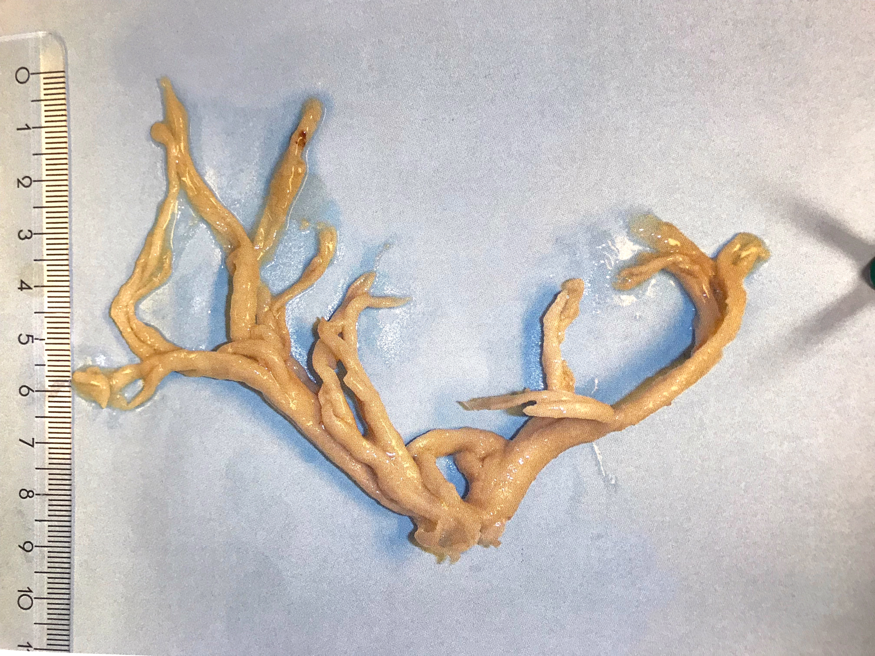Den deskriptive diagnosen av materialet var plastisk bronkitt, som kan opptre sekundært til sykdommer i lunger, hjertet eller lymfesystemet. Protein- og lipidrik væske lekker ut i bronkiene og danner avstøpninger av bronkialtreet (1) . Tilstanden er sjelden, men kan oppstå i alle aldre og hos begge kjønn. Nest etter kirurgisk korreksjon av medfødt hjertesykdom (oftest Fontan-kirurgi), er astma og atopi den vanligste assosierte tilstanden. Mortaliteten er estimert til 6–60 %, og vanligste dødsårsak er obstruksjon av sentrale luftveier (1) . Diagnosen stilles typisk ved bronkoskopi. Behandlingen i akuttstadiet er å fjerne avstøpningen, enten ved bronkoskopi eller ved at pasienten selv hoster opp materialet. Samtidig må antatt utløsende årsak behandles.