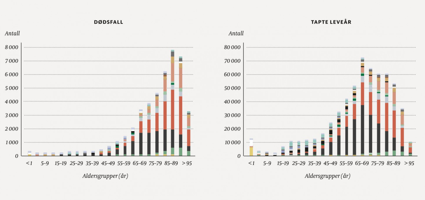 Figur 1 viser fordelingen av sykdomsbyrde i form av dødsfall, tapte leveår, ikke-dødelig helsetap og helsetapsjusterte leveår etter alder i 2016. Kreft var en viktig dødsårsak fra 40–50-årsalderen, mens hjerte- og karsykdom og demens dominerte i de eldste aldersgruppene. Ulykker, overdoser og selvmord var viktige årsaker til tapte leveår blant unge og voksne opp til 40 år, mens kreft var mer dominerende for dem mellom 40 og 80 år. Dødsfall og tapte leveår i Norge rammer i stor grad befolkningen over 60–70 år, mens det ikke-dødelige helsetapet er betydelig allerede fra 10–20 års alder og holder seg høyt resten av livet. Psykiske lidelser blir for eksempel viktig allerede fra 10-årsalderen, og muskel- og skjelettlidelser fra 20-årsalderen.