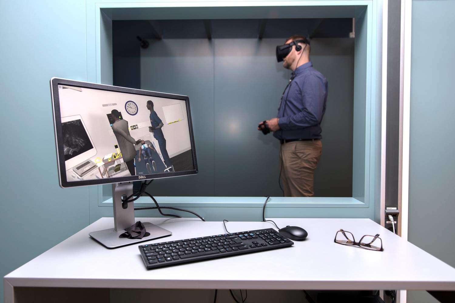 Det hadde vi glemt. Vi er inne i et dataspill, i en virtuell virkelighet. Vi har på oss VR-briller. Vi er i Trondheim, på VR-laboratoriet på Norges teknisk-naturvitenskapelige universitet (NTNU), landets største treningsarena for virtuell medisinsk simulering. Og den pasienten, den finnes egentlig ikke.