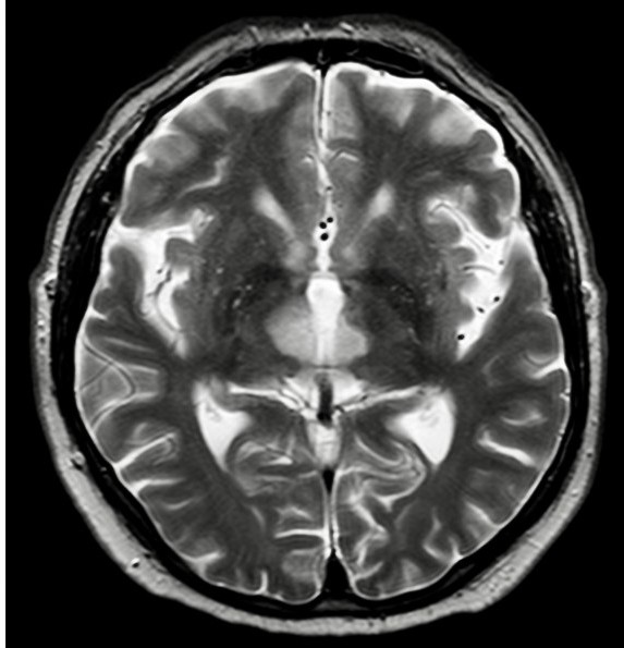 Vår pasient var en mann i slutten av 60-årene, som brått ble bevisstløs på ferie i utlandet. Han ble raskt hentet av ambulanse og kjørt til nærmeste sykehus. Det ble ikke gitt trombolytisk behandling fordi årsaken til bevissthetstapet var uklar. Ved ankomst ble han intubert og man bemerket at venstre pupill var større enn høyre. CT caput og CT angiografi tatt innleggelsesdagen var uten aktuelle patologiske funn. MR caput tatt dag 4 av sykehusoppholdet påviste infarkter bilateralt medialt i thalamus (bildet til høyre).