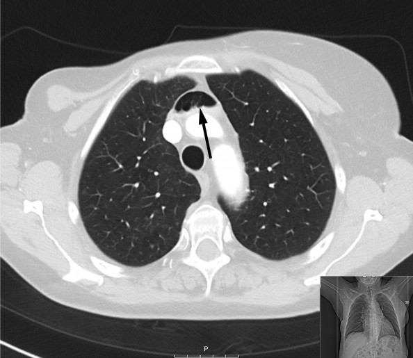 Sannsynligvis har det i forbindelse med kontrastundersøkelsen blitt injisert luft venøst. Vakthavende intensivlege ble varslet etter at radiolog hadde gransket bildene, og pasienten ble tilsett umiddelbart. Hun var respiratorisk og sirkulatorisk stabil, med lettgradig dyspné som eneste symptom. Hun ble leiret i venstre sideleie med hodet litt lavere enn kroppen (Durants manøver) og fikk ti liter oksygen på maske med reservoar. Dykkerlege ved Haukeland universitetssykehus ble kontaktet.