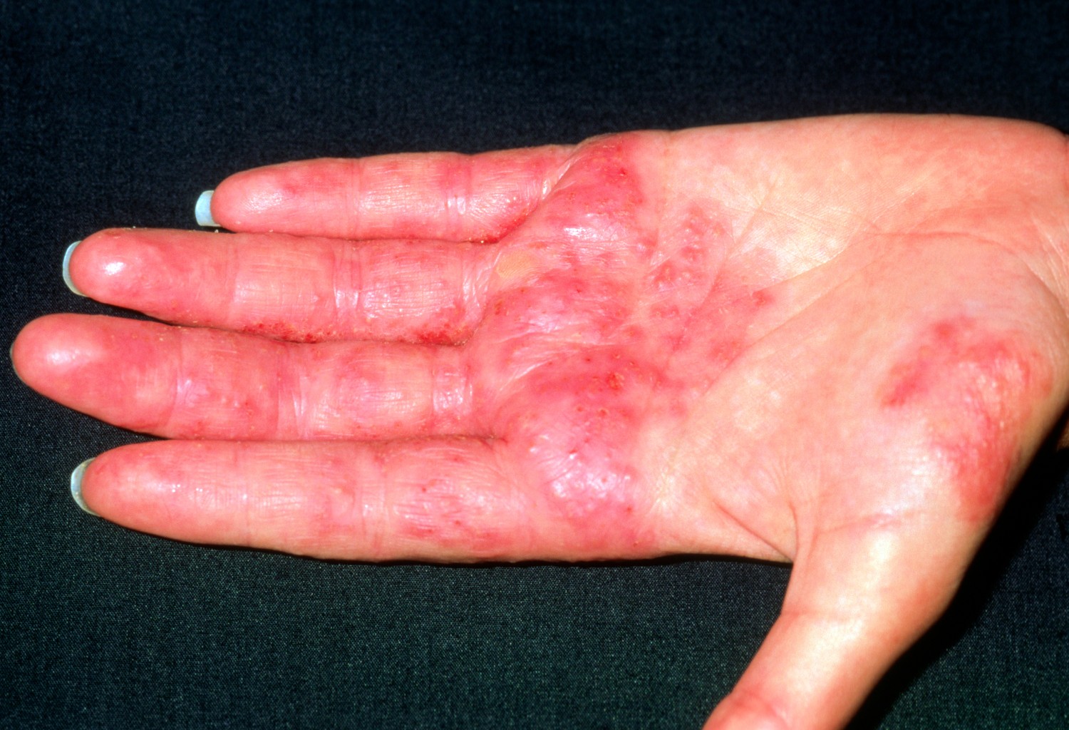 Bildet kan representere ulike varianter av håndeksem uavhengig av etiologi. Klinisk er det ingen klar sammenheng mellom håndeksemets morfologi og etiologi. Efflorescensene er ikke riktig beskrevet. Vi beklager denne feilen.