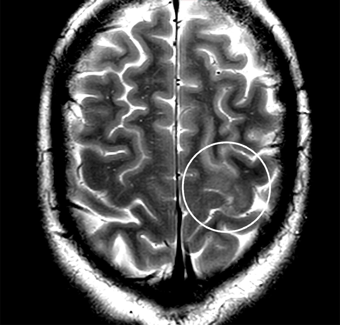 MR-funnet ble tolket av nevroradiolog. Det var ikke helt typisk for et kortikalt infarkt, men kunne være et resultat av tidlig trombolytisk intervensjon. Forandringer etter et epileptisk anfall kunne heller ikke utelukkes.