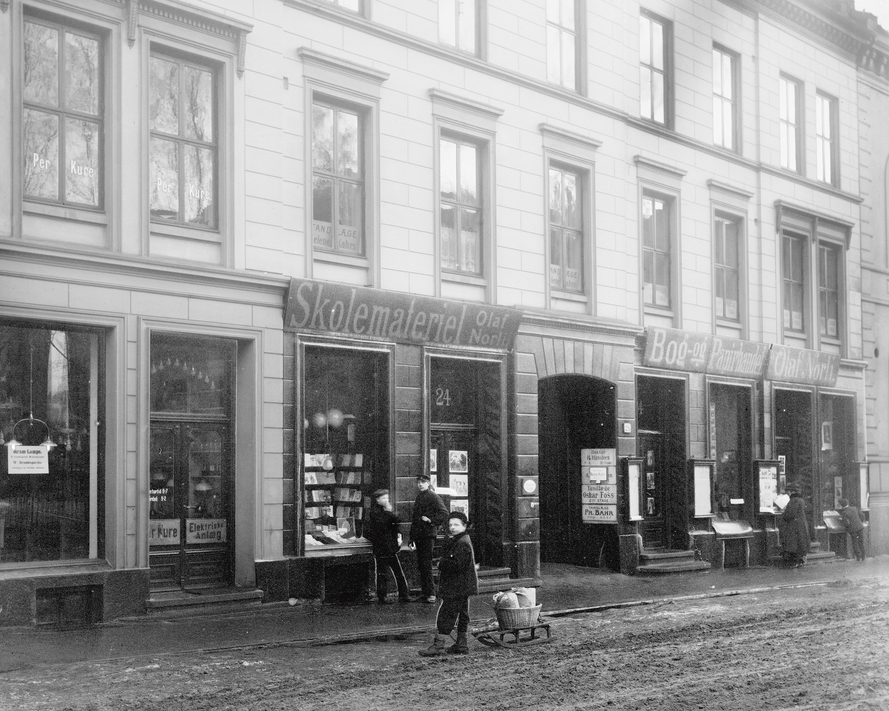 Bokhandelen Olaf Norli i Universitetsgata 24 ble Æsculaps første utsalgssted. Bildet er tatt omkring ti år før studentavisens start. Foto: Narve Skarpmoen / Nasjonalbiblioteket