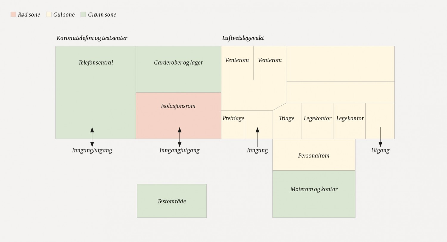 Koronasenteret er delt i tre soner (figur 1). I grønn sone er det ikke krav om arbeidstøy eller uniform og ikke bevegelsesrestriksjon. Gul sone er «aktsomhetssone», der alle har på ren uniform (hvitt sykehustøy), og alle som oppholder seg nærmere enn to meter fra pasient, skal bruke personlig beskyttelsesutstyr. Rød sone er sone med høy risiko for smittespredning. Der er det kun strengt nødvendig personell som har adgang, og da ikledd personlig beskyttelsesutstyr. Personlig beskyttelsesutstyr inkluderer fuktbestandig smittefrakk med lange ermer, hansker, briller eller visir og åndedrettsvern. Renholdspersonale utfører kontaktpunktdesinfeksjon mellom hver pasient i gul og rød sone.