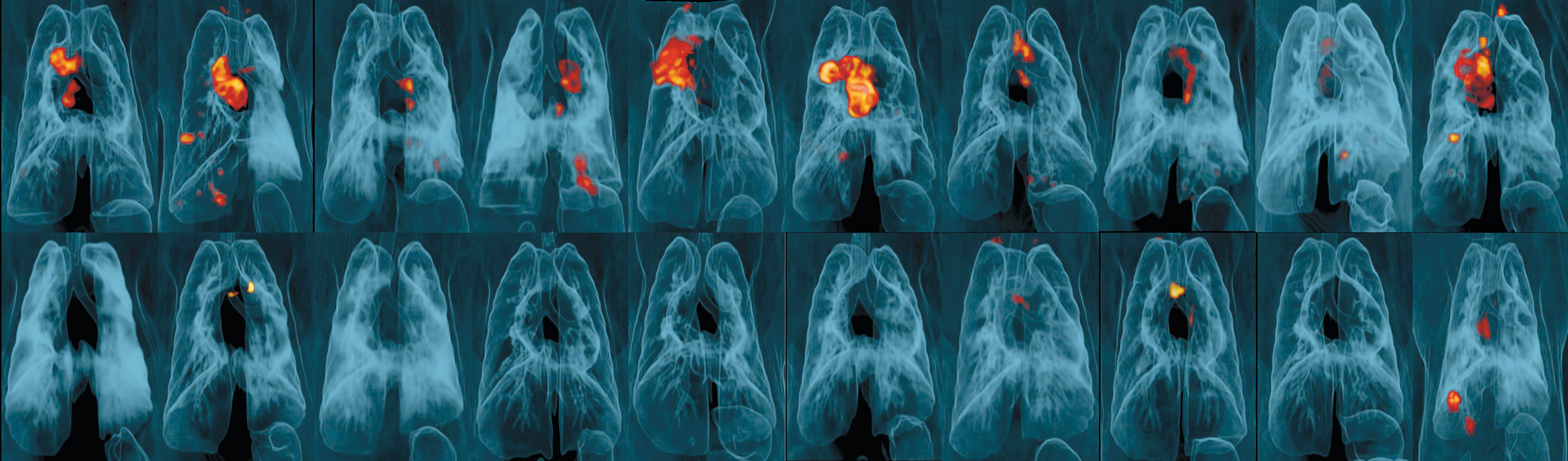 Lungene til apene i studien. Det røde og gule viser betennelse fra tuberkulose. Dyrene på øvre rad fikk BCG-vaksinen intradermalt og apene på den nedre rad fikk vaksinen intravenøst. Illustrasjonsfoto: AP/NTB Scanpix