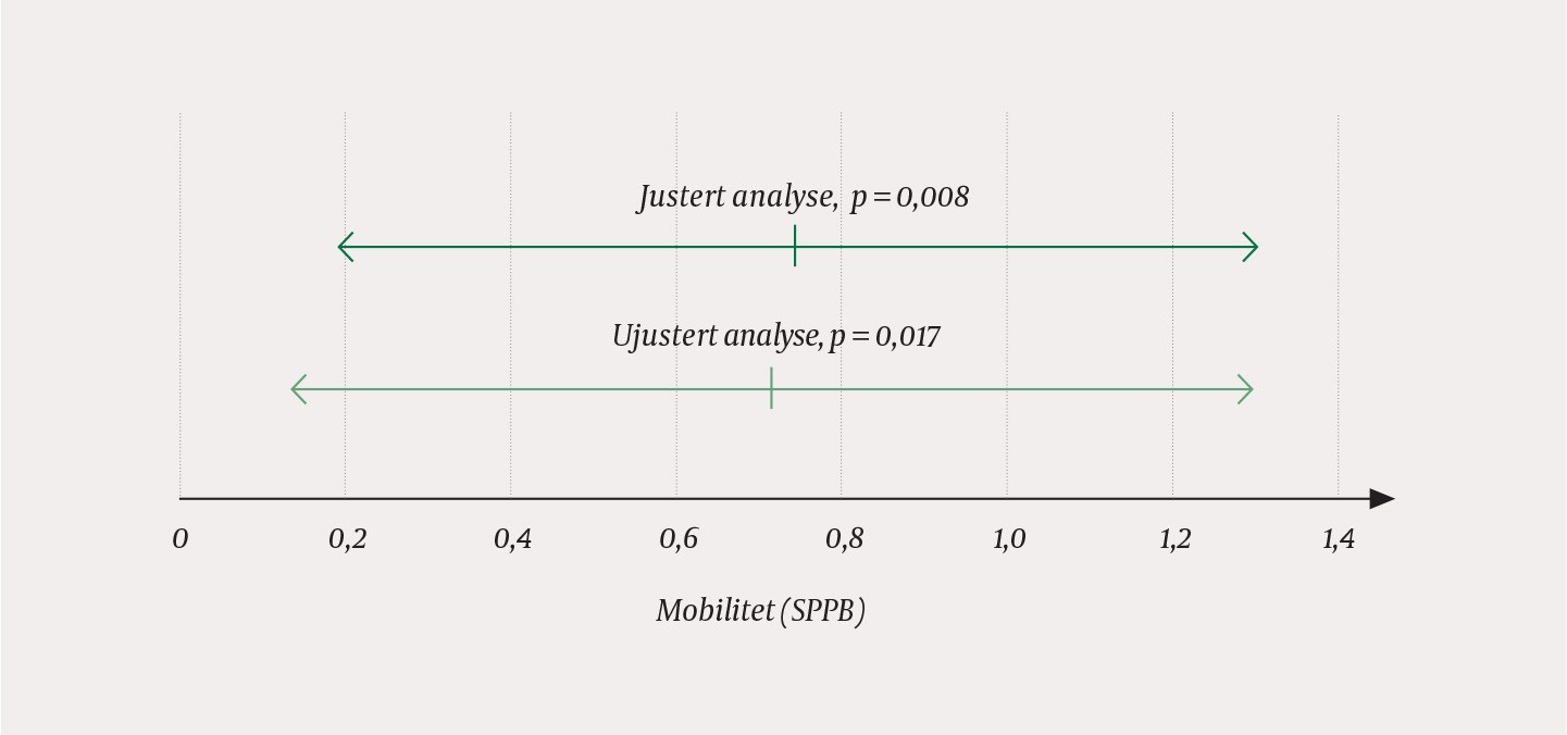 I en randomisert kontrollert studie sammenliknet vi to behandlingsforløp for pasienter med hoftebrudd (4, 5) . Den primære utfallsvariabelen var mobilitet, målt med screeningtesten «Short Physical Performance Battery» (SPPB). Dette er en skalavariabel som går fra 0 til 12, og en differanse på over 0,5 regnes som klinisk relevant (4) . Pasientens alder, kjønn og type brudd var forhåndsvurdert som mulige prediktorer for mobilitet, og det ble justert for disse. Vi fant en klinisk relevant og statistisk signifikant effekt fire måneder etter operasjon (figur 1). Vi ser av figuren at den justerte analysen ga praktisk talt samme estimat som den ujusterte, men med smalere konfidensintervall og lavere p-verdi, noe som vanligvis vil være tilfelle. I logistisk regresjon kan det også være aktuelt å justere for slike prediktorer, men da blir estimatet vanskeligere å tolke (1, s. 417).