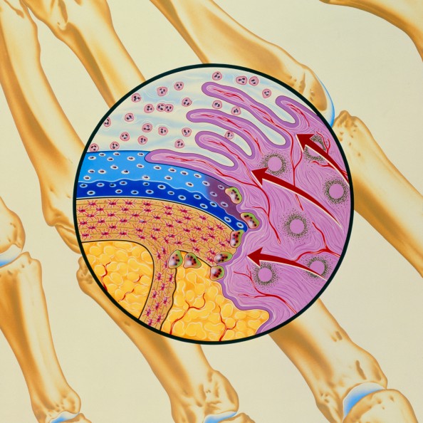 Den betente synovialhinnen produserer fibrøst, vaskulært vev kalt pannus (lilla), som etter hvert vil dekke leddbrusken. Synovialvæsken (hvit) fylles med hvite blodceller som stimulerer frigjøring av enzymer som ødelegger bein og brusk. Illustrasjon: Science photo library / NTB Scanpix