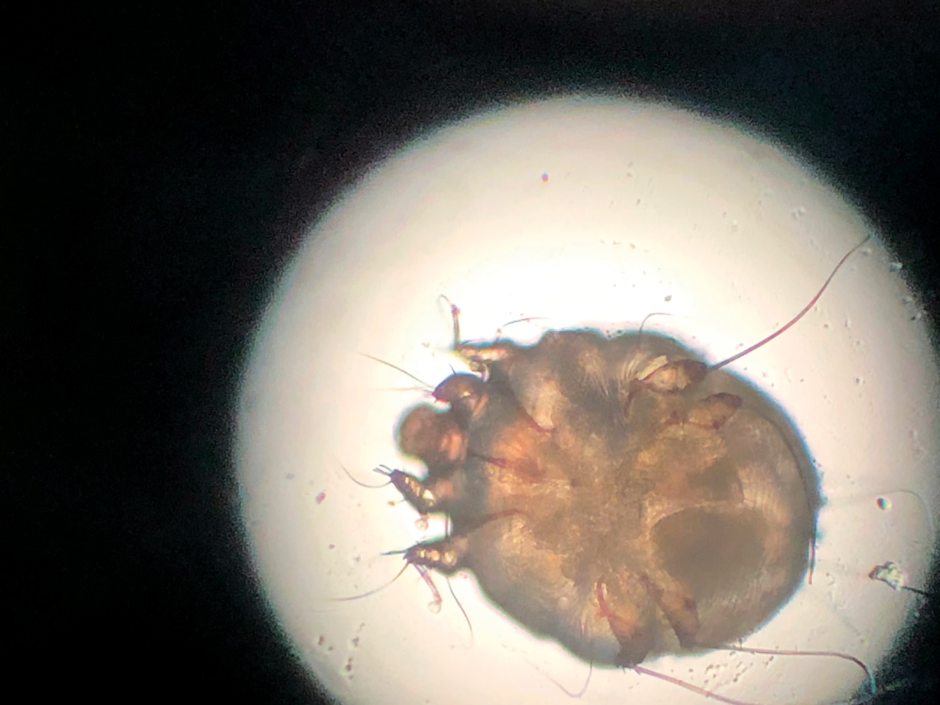Bildet viser mikroskopi av ein skabbmidd – Sarcoptes scabiei . Den vart plukka ut med tannlegesonde frå ein skabbgang hjå ein pasient. Familiemedlemmer i fleire generasjonar var smitta. I alt vart om lag ti personar behandla etter gjeldande retningslinjer frå Folkehelseinstituttet (1) .