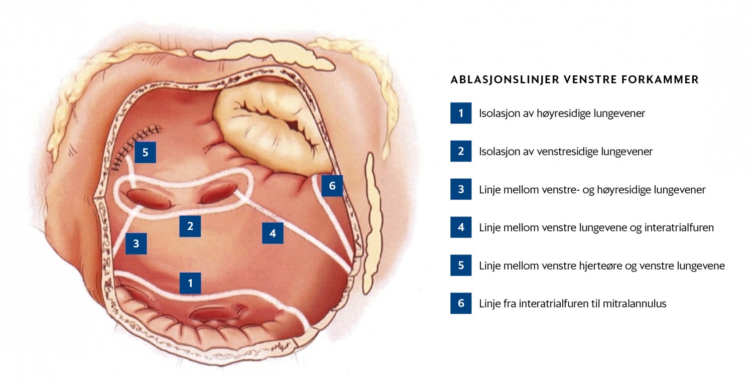 Ablasjonene ble utført med bipolart utstyr (Cardioblate LP, Medtronic, Minneapolis, MN, USA) og/eller unipolart utstyr (Cardioblate Monopolar Pen, Medtronic) forbundet med en radiofrekvensgenerator (Cardioblate 68000 RF Generator, Medtronic). Under ablasjon ble vevet kjølt ned med saltvannsinfusjon. Ablasjonslinjene er skjematisk visualisert i figur 1 og figur 2. Alle pasientene fikk anlagt fullt sett av ablasjonslinjer uavhengig av type atrieflimmer og hovedinngrep. Bipolart utstyr ble brukt til lungeveneablasjon og linjen mellom øvre og nedre hulvene. De andre linjene ble generert med kombinasjoner av unipolart og bipolart utstyr. Lungeveneablasjon ble utført på bankende hjerte (før kardioplegi). Primært ledningsblokk mellom lungevener og venstre atrium ble oppnådd hos 16 pasienter, mens tre trengte flere ablasjoner for å oppnå blokk. I tillegg ble venstre aurikkel amputert (n = 9) eller ligert/lukket med sutur (n = 8) eller suturmaskin (n = 2).