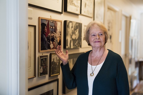 – Jeg pleier ikke være så nøye på det, men det regner, og vi vasker selv. Ja, det har vi alltid gjort. Det er en måte å holde seg i form på. Olav støvsuger, og jeg vasker. Vi har alltid delt på husarbeidet, forklarer Gro i farten, uaffisert av våre fomlete smittevernsprosedyrer. Vi tar frem den obligatoriske håndspriten og dynker hendene. Hun geleider oss effektivt inn i stuen. På veien inn kaster vi et stjålent blikk på veggene. Fotografier og tegninger gir små glimt av sentrale øyeblikk i norsk politisk historie: Gro som miljøvernminister på 1. mai-talerstolen i Porsgrunn. Det kjente VG-fotografiet der Reiulf Steen uskarpt i bakgrunnen skuler mot en ung Gro som er på vei til å bli partileder og Norges første kvinnelige statsminister. Gösta Hammarlunds avisportrett for Dagbladet da hun nylig var blitt det. På en tegning holder Gro tidligere NRK-sjef og daværende partikollega Bjartmar Gjerde i kragen.
