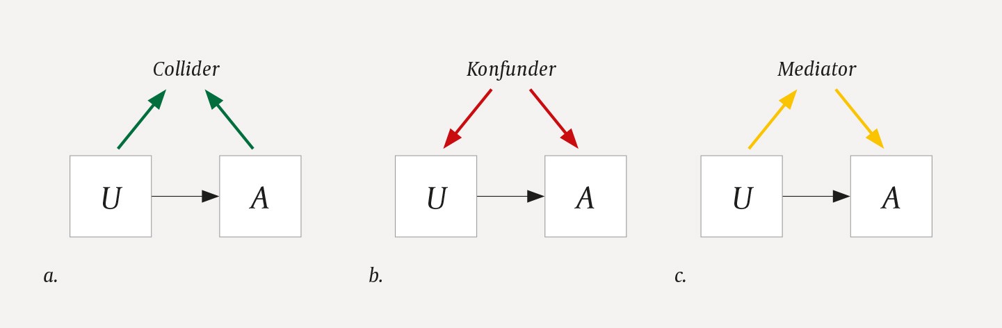 I situasjon 1a kalles den tredje variabelen en collider. Her påvirker den ikke sammenhengen mellom den uavhengige og den avhengige variabelen, og skal ikke tas med i den statistiske analysen. Dersom man vil undersøke om diabetes påvirker risikoen for hjertesykdom, og tar med sykehusopphold i analysen – som er en virkning av begge faktorene, ikke en årsak – vil det gi et feilaktig bilde av sammenhengen mellom diabetes og hjertesykdom. Collidere er skumle fordi man ubevisst kan ha tatt dem med i analysen, for eksempel ved å kun samle inn data fra personer innlagt på sykehus. Da har man i praksis feilaktig justert analysen for en collider. Dette er en bekymring i mange covid-19-studier (1).