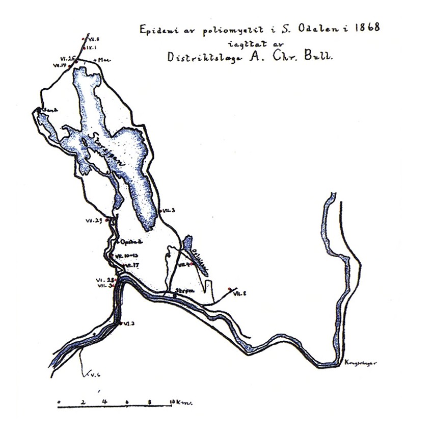 Efterat Sygdommen havde varet 4–5 Dage, indtraadte der en Vending, enten utbredte Paralysen sig videre, strakte sig omsider til Respirationsorganerne, og Døden paafulgte under lige til det sidste vedligeholdt fuld Bevidsthed, efterat Sygdommen i det hele neppe havde varet en Uge, – eller ogsaa forsvant alle Phænomen av Feber temmelig hurtig, i Regelen tillige Æmfiendligheden i Ryggen samt Smerterne, og med Undtagelse af den til intetgjorte eller svekkede Brug af et eller flere Lemmer begyndte de Syge forresten at komme sig temmelig snart. Paralysen ble for de flestes Vedkommende mindre og mindre udtalt og blev som oftest kun en Parese, og medens Lammelsen i Begynnelsen var ubtredt til alle et Lems Muskler, indskrænkedes Paresen senere kun til enkelte, saa at der opstod Contractur ved de ikke lammede Musklers Overmagt. Alle de 9, der overlevde Sygdommen er nu paa Benene, og de 6 er blevne betydelig bedre udover Vinteren, 3 kunne derimot kun gaa ved Hjælp av Krykker.»