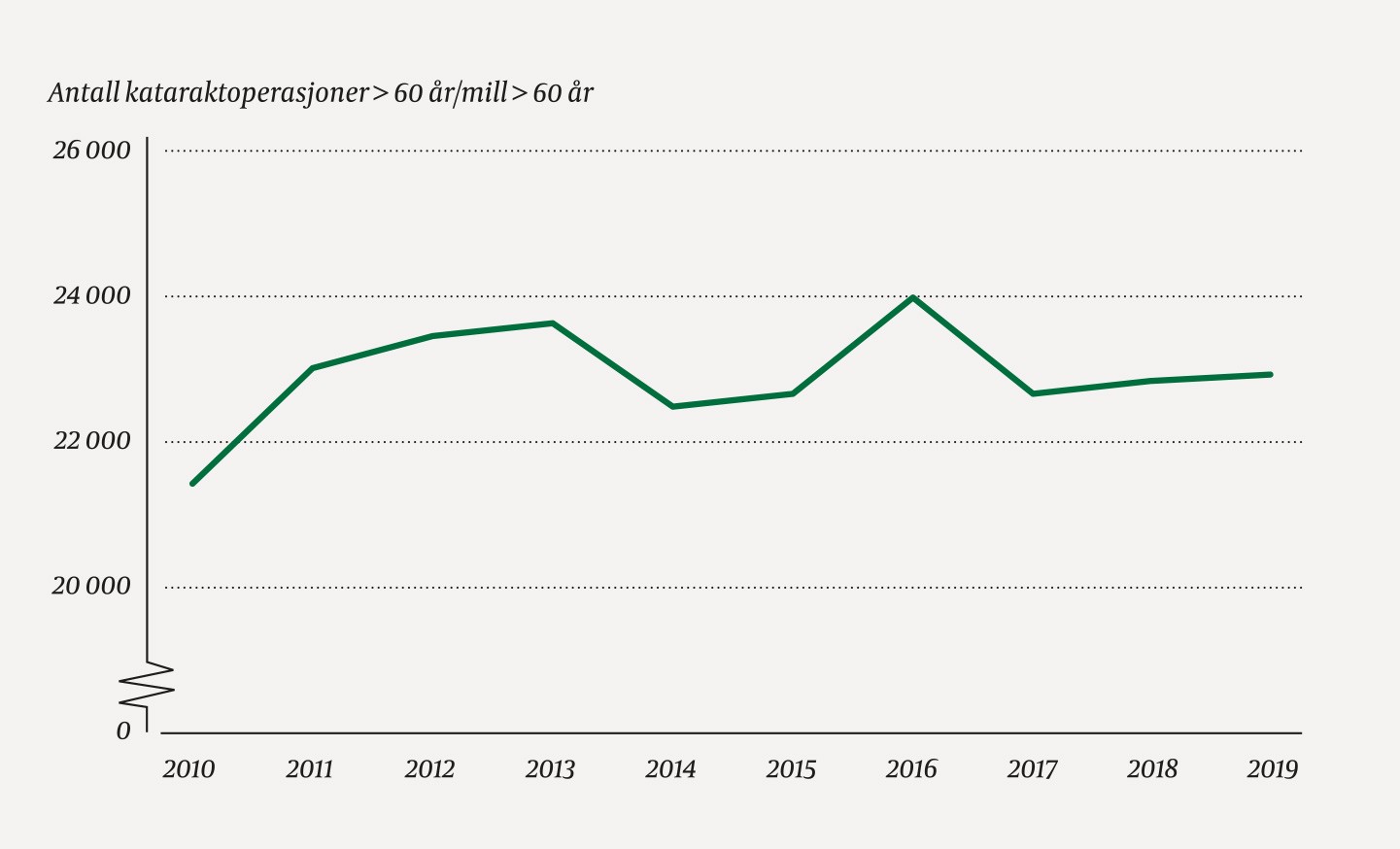 Antall kataraktoperasjoner og antall opererte pasienter per år i Norge økte i perioden 2010–19 (Figur 1). Antall operasjoner per million i den generelle befolkningen økte med 21 % fra 7 480 til 9 063 per million innbyggere (Tabell 1), med en forbigående liten nedgang i 2014 og 2017. Aldersgruppen over 60 år hadde i perioden dobbelt så stor vekst som totalbefolkningen. Antall opererte personer per million innbyggere i aldersgruppen over 60 år viste en svak stigning i perioden fra 21 383 til 22 890 (Figur 2).