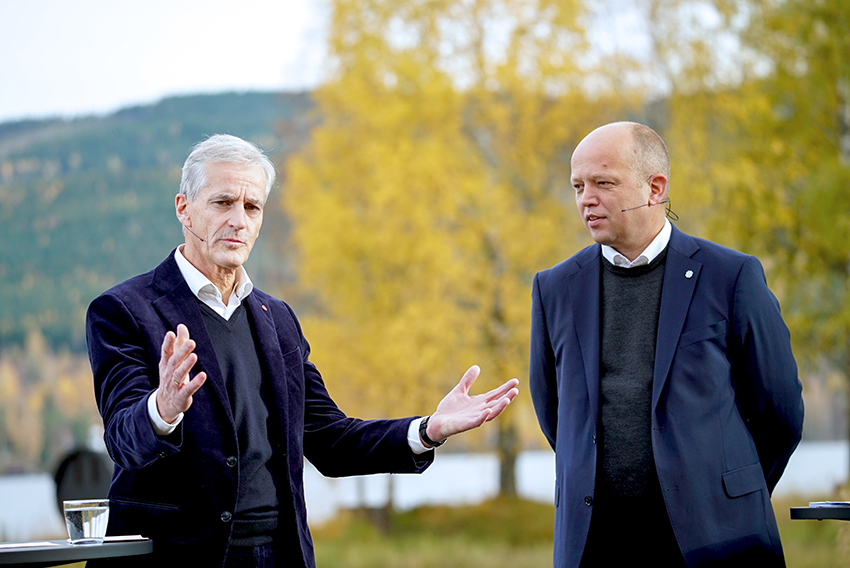 PRESENTERTE PLATTFORMEN: Jonas Gahr Støre (Ap) og Trygve Slagsvold Vedum (Sp) på Hurdal da de la frem den nye regjeringsplattformen for pressen. Foto: Arbeiderpartiet