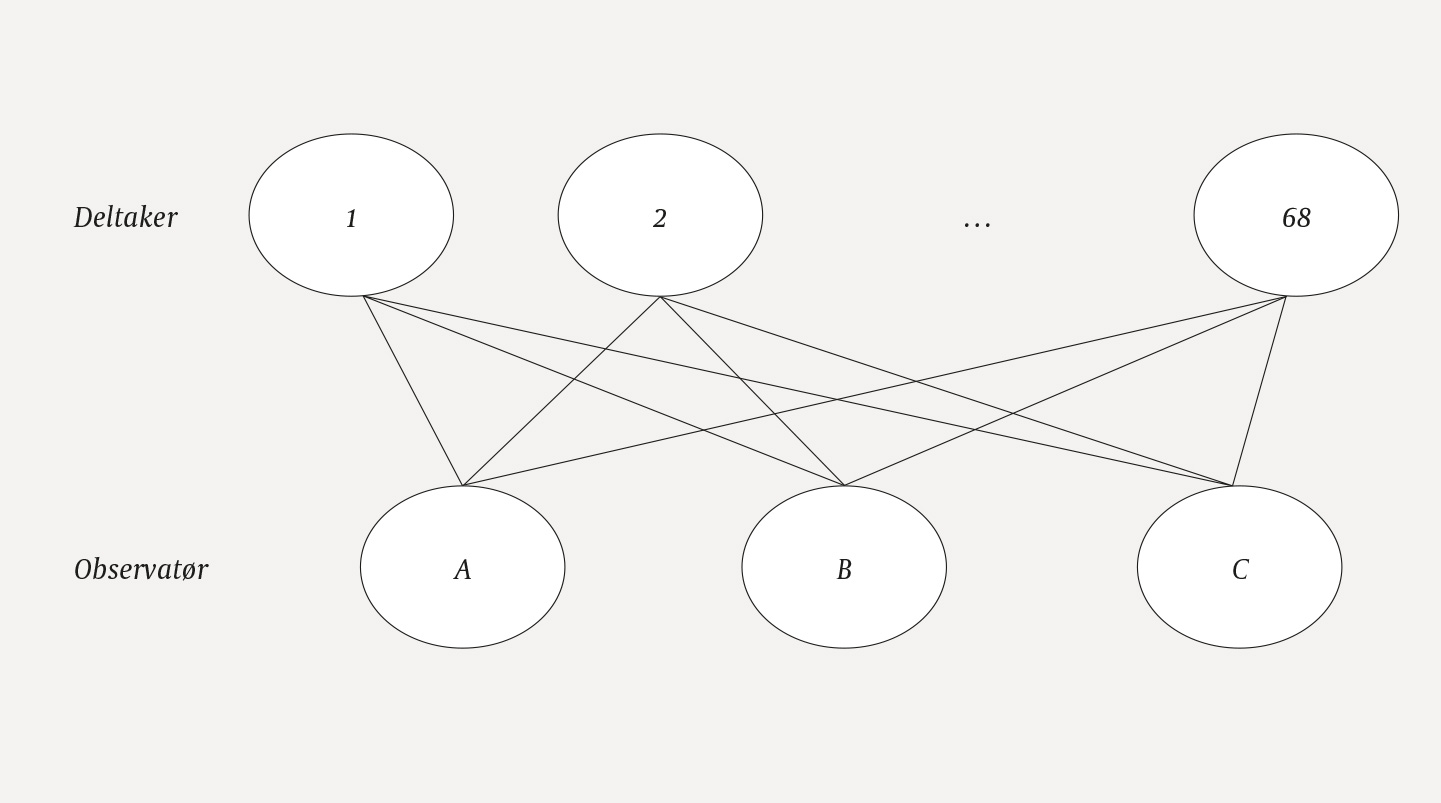 Korrelasjonen mellom skårer fra to observatører på samme deltaker er lik varians mellom deltakerne delt på totalvariansen, altså 33,44 / 37,11 = 0,90 (4, s. 121). Denne intraklassekorrelasjonskoeffisienten er et mål på interobservatørsamsvar (inter-rater reliability). Korrelasjonen mellom to skårer fra samme observatør på samme deltaker, derimot, er lik summen av varians mellom deltakerne og varians mellom observatørene, delt på totalvariansen, altså (33,44 + 0,74) / 37,11 = 0,92 (4, s. 129). Denne intraklassekorrelasjonskoeffisienten er et mål på intraobservatørsamsvar (intra-rater reliability), altså hvis observatøren skårer samme deltaker på ny etter å ha glemt hvilken skår som ble gitt første gang.