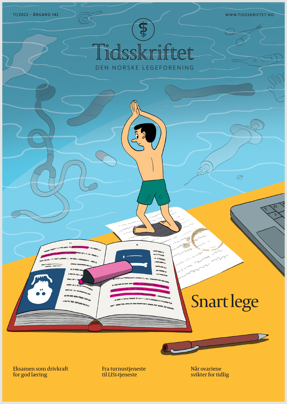 Tegneserieskaper og grafisk designer Kristoffer Kjølberg har utformet forsideillustrasjonen til dette nummeret av Tidsskriftet: «Jeg har illustrert eksamenssituasjonen som et stup fra den teoretiske studietiden ut i en praktisk tilværelse som for noen kanskje kan virke litt skremmende. Alt står og faller på hvordan du gjennomfører det stupet.»