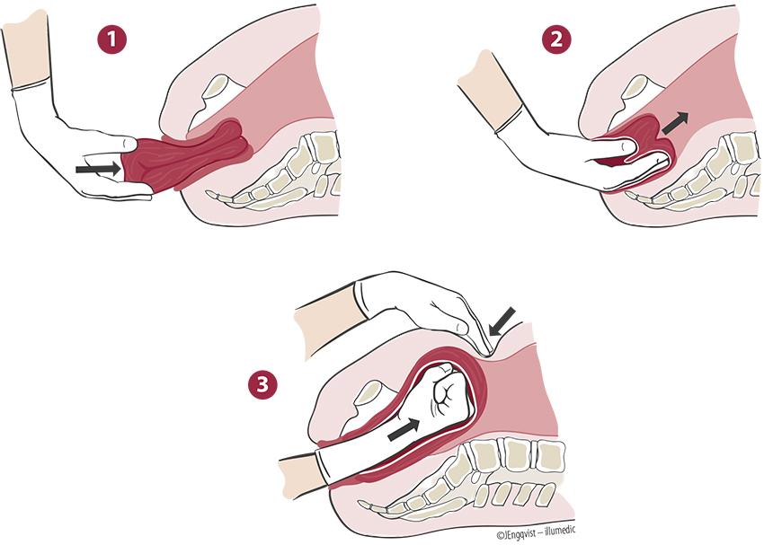 I litteraturen beskrives flere metoder for manuell reposisjonering av livmoren, og dr. Johnson var den første til å beskrive en slik metode (2). Ved Johnsons manøver skyver gynekologens hånd livmortoppen tilbake gjennom overgangen mellom livmor og livmorhals. Samtidig skyves livmoren opp gjennom skjeden og opp av bekkenet til den er posisjonert like over pasientens navlenivå. Gynekologens hånd holdes slik inne i livmorhulen i 3–5 minutter for å forebygge tilbakefall (figur 1).