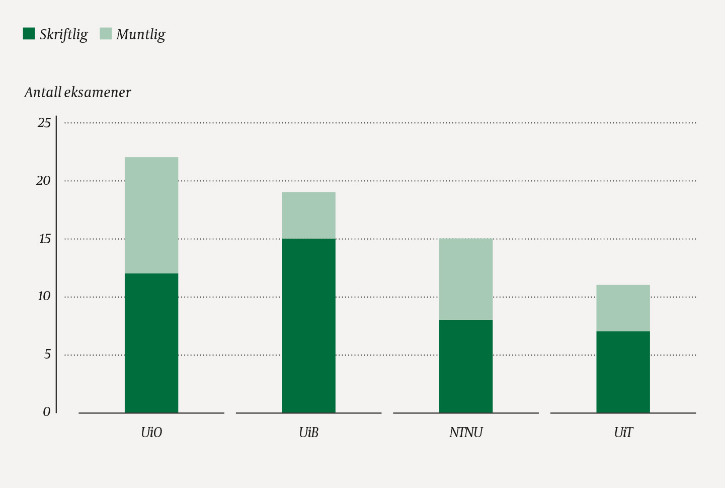Disse eksamensformene kan også grovt inndeles i skriftlige og muntlige eksamener (ramme 3). Det totale antallet eksamener gjennom studiet varierte fra 11 (UiT) til 22 (UiO). Antall skriftlige eksamener varierte fra 7 (UiT) til 15 (UiB) (figur 1).