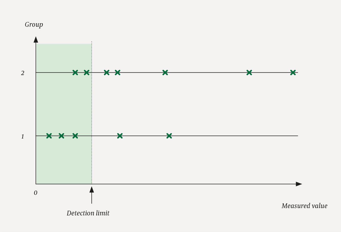 La oss starte med et eksempel: Figur 1 viser et tenkt datasett der man har målt konsentrasjonen av et stoff i serum hos to pasientgrupper. Kryssene viser de faktiske verdiene, men det er bare de over nedre deteksjonsgrense som lar seg måle. Vi vet hvor mange verdier som er under deteksjonsgrensen, men ikke de faktiske verdiene. Dette er manglende data som i høy grad mangler ikke-tilfeldig (missing not at random , MNAR), da sannsynligheten avhenger av at den ikke-observerte verdien er under deteksjonsgrensen (1) .