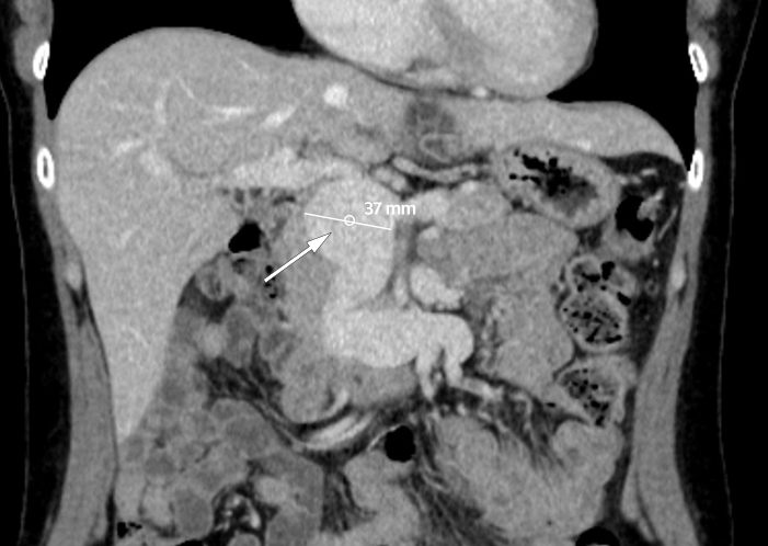 CT-bildet viser et 37 mm stort aneurisme i portvenen, inklusive stammen til vena mesenterica superior og grener til denne. Pasienten var en kvinne i 40-årene med tidligere anoreksi. Hun hadde i fire uker vært plaget av diffuse magesmerter og tidlig metthetsfølelse. Klinisk undersøkelse og orienterende blodprøver hos fastlege, herunder leverprøver, viste normale funn, og hun ble henvist til CT.