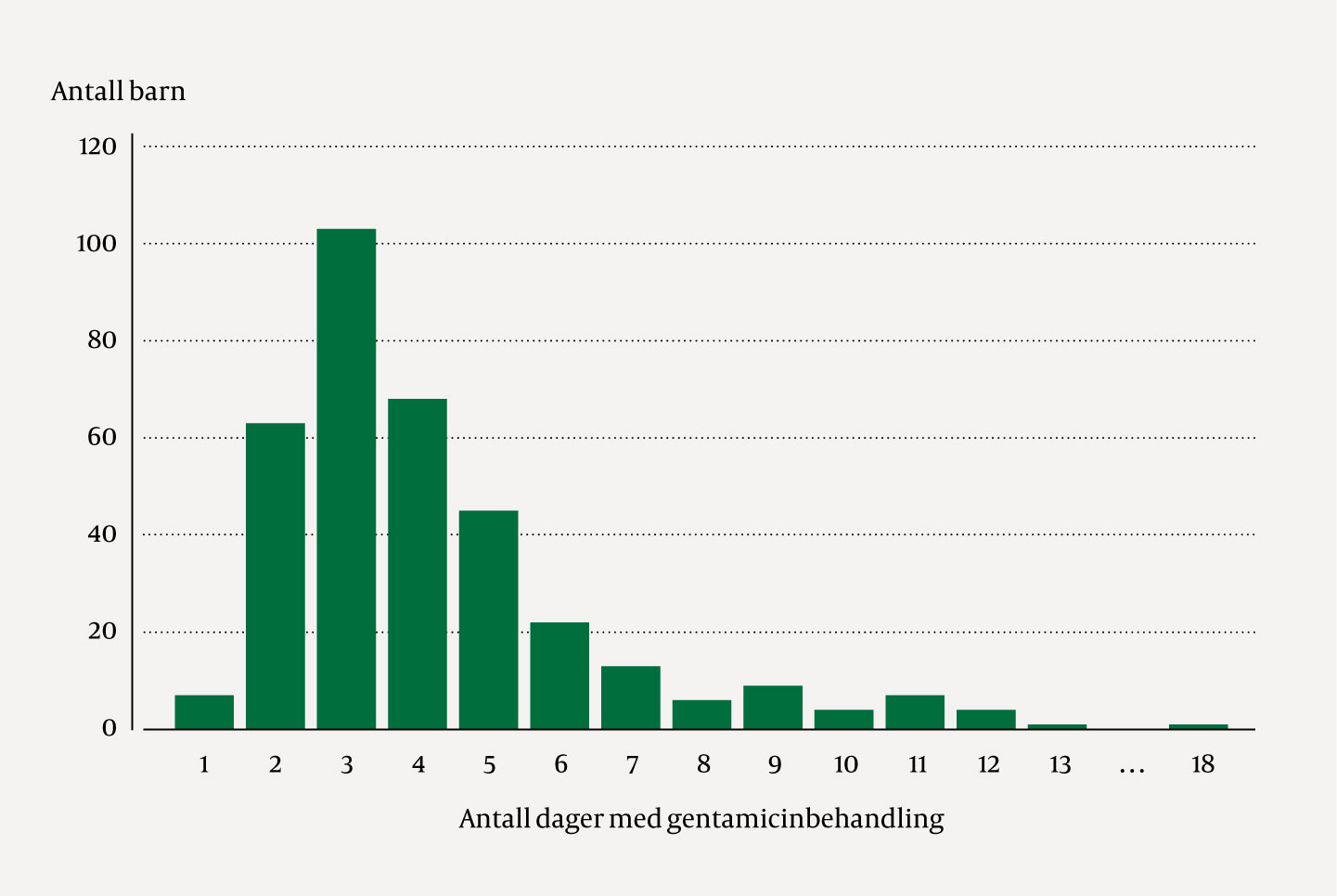 Fra St. Olavs hospital og Universitetssykehuset Nord-Norge ble 292 barn inkludert i studien, 129 jenter og 163 gutter. Ved St. Olavs hospital reserverte fire foreldrepar seg mot deltakelse, mens ingen reserverte seg ved Universitetssykehuset Nord-Norge. Noen barn ble behandlet gjentatte ganger, slik at 353 behandlingsepisoder er evaluert fra disse to sykehusene (tabell 1). Indikasjonene for gentamicinbehandling var urinveisinfeksjoner, febril nøytropeni, sepsis og andre mistenkte eller bekreftede alvorlige infeksjoner. Ved 26 av 353 (7,4 %) behandlingsepisoder var det vekst i blodkultur, 9 av disse 26 episodene var hos barn med kreft. Median behandlingsvarighet for alle episodene var 4 dager (interkvartilbredde 3–5) (figur 1). Fra Haukeland universitetssjukehus identifiserte vi 556 barn behandlet med gentamicin og med s-gentamicin-0-prøver. To barn med 0-prøver som viste s-gentamicinverdier på henholdsvis 5,0 mg/L og 32,2 mg/L, begge med normale kreatininverdier, ble ekskludert, da disse verdiene ble tolket som feilmåling og urealistiske 24 timer etter en dose på 7 mg/kg. Fra Oslo universitetssykehus, Ullevål sykehus, identifiserte vi 381 barn behandlet med gentamicin og med 0-prøver.