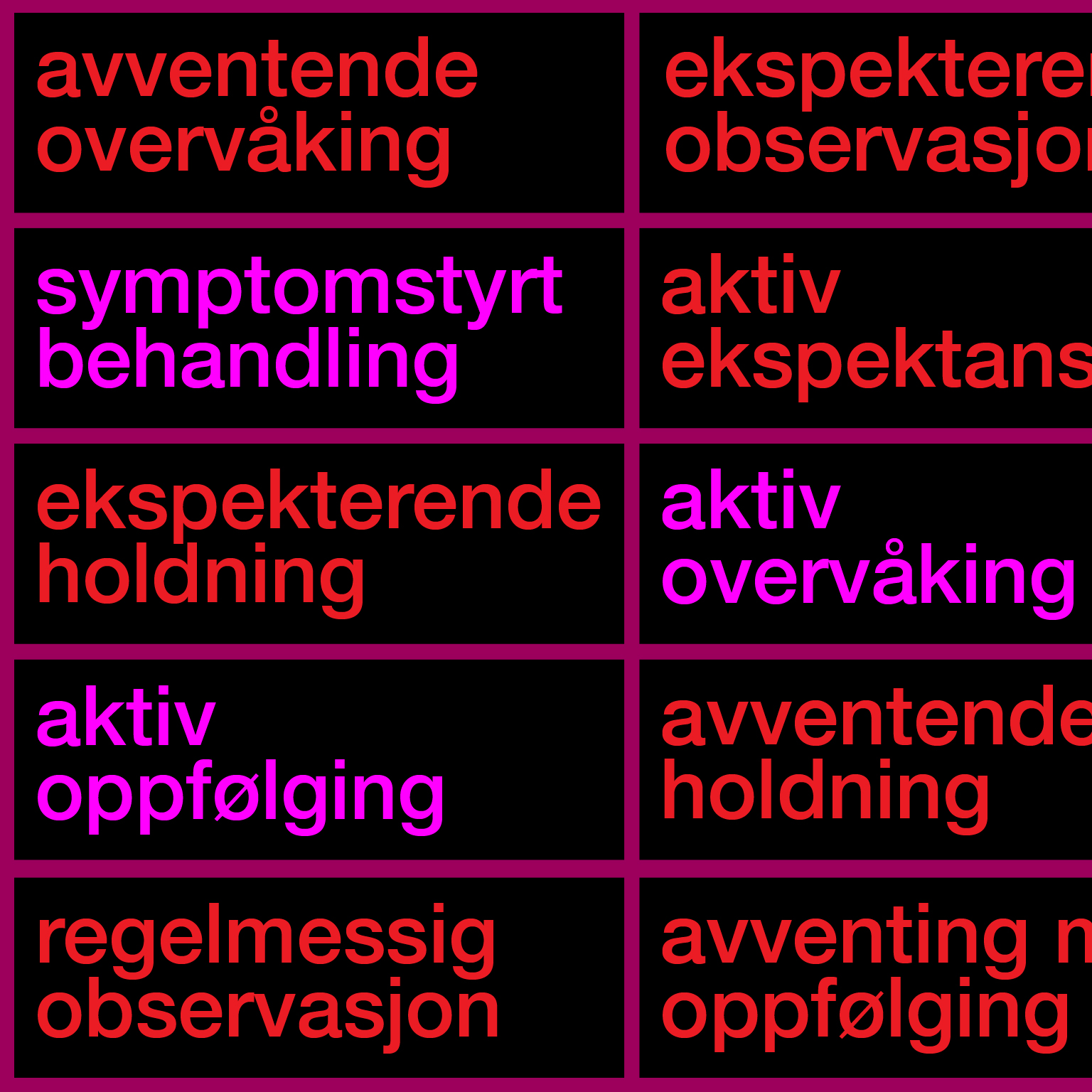 Problemet er altså at uttrykket watchful waiting er blitt flertydig. Det kan derfor skape misforståelser og bør unngås. Vi anbefaler heller å bruke uttrykk som aktiv oppfølging eller aktiv overvåking om pasienter som følges opp med kliniske kontroller og tester, og symptomstyrt behandling der valg av behandling gjøres på grunnlag av pasientens symptomer og plager.