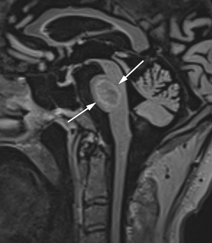 MR-bildet (sagittal FLAIR) viser et patologisk område sentralt i pons, avgrenset av en perifer brem med høyt signal. Sammenholdt med sykehistorie, kliniske funn og blodprøver var forandringene forenlige med osmotisk demyelinisering.