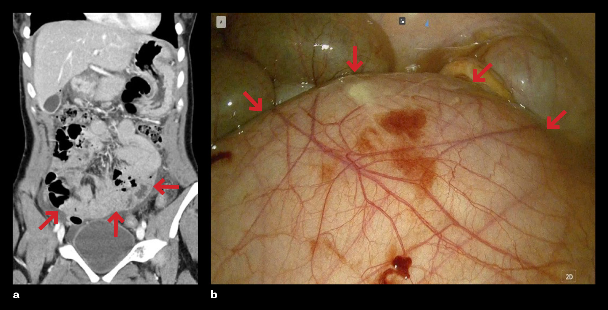 På grunn av de uventede peroperative funnene ble CT-bildene og operasjonsvideoen gjennomgått i etterkant. Funnene er mest forenlig med medfødt peritoneal innkapsling, en sjelden tilstand hvor en tynn, aksessorisk peritonealmembran dekker hele eller deler av tynntarmen. Peritonealmembranen er festet lateralt til colon ascendens og descendens, superiort til colon transversum og inferiort til bakre overflate av parietale peritoneum. De fleste tilfeller er asymptomatiske og avdekkes tilfeldig peroperativt eller ved obduksjon (1) . For pasienter som utviser symptomer, er magesmerter, kvalme og oppkast vanligst, ofte som uttrykk for partiell eller komplett tynntarmsileus.