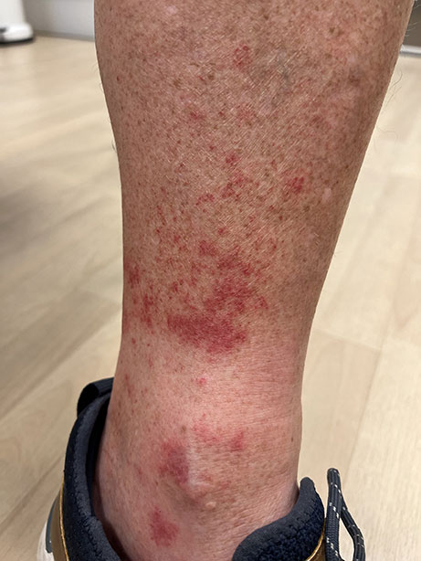 Fotografiet viser et utslett bestående av purpuriske konfluerende makler og papler over distale del av venstre legg.