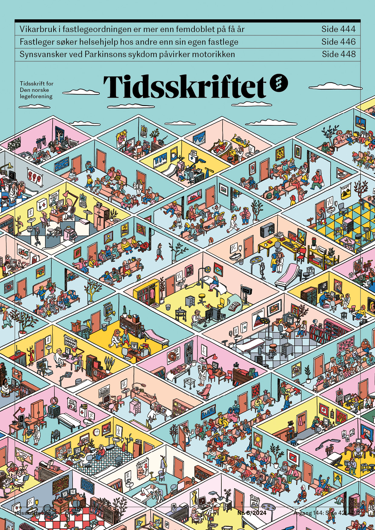 Forside Forside nr. 6/2024 () sporsmal_grey_rgb Artikkel Illustrasjon: Anders N. Kvammen Venteværelser, legekontorer og sykehuskorridorer. Helsevesenet har mange rom. Som regel myldrer det av syke og friske mennesker. Dører åpnes og lukkes. Noen kommer, andre går. Noen blir igjen. Summen av alle hendelsene innenfor veggene utgjør legers arbeidsliv. Det fysiske interiøret varierer mellom arbeidsplassene. Men alle rommer de historier om enkeltskjebner, sorger, gleder og menneskemøter. Anders N. Kvammen er en tegner og serieskaper fra Oslo. Flere av hans arbeider kan du se på hjemmesiden www.anderskvammen.com og på Instagram: @kvamsky. Kommentarer ( 0 ) Dette kommentarfeltet modereres, men kommentarer blir ikke redaksjonelt behandlet ut over å sikre at de følger retningslinjer for vårt kommentarfelt. Denne artikkelen ble publisert for mer enn 12 måneder siden, og vi har derfor stengt for nye kommentarer. Publisert: 13. mai 2024 Utgave 6, 14. mai 2024 Tidsskr Nor Legeforen 13. mai 2024 Vol. 144. doi: 10.4045/tidsskr.24.06.02 PlumX Publisert: 13. mai 2024 Utgave 6, 14. mai 2024 Tidsskr Nor Legeforen 2024 Vol. 144. doi: 10.4045/tidsskr.24.06.02 Plum Print visual indicator of research metrics PlumX Metrics PDF Får du ikke vist PDF-filen eller vil lagre filen, kan du høyreklikke på PDF-ikonet. Velg «Lagre mål/fil som..» og hent så opp PDF-filen i for eksempel Acrobat Reader. Skriv ut Anbefalte artikler