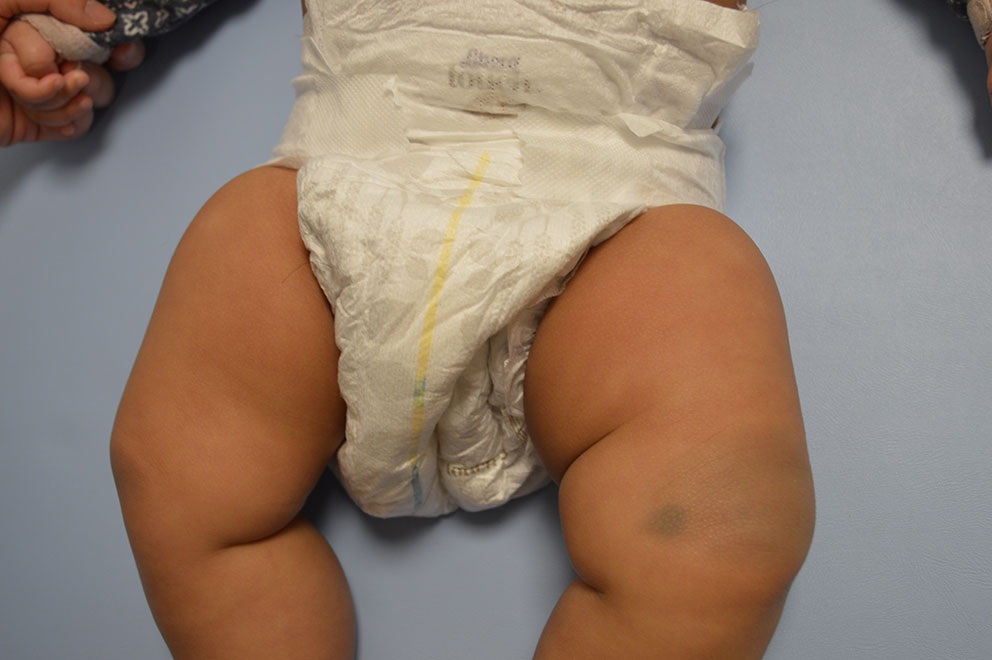 Bildene viser uregelmessige, blågrå flekker på rygg og venstre underekstremitet hos en seks måneder gammel jente av asiatisk opprinnelse som var til rutinemessig undersøkelse ved helsestasjonen.