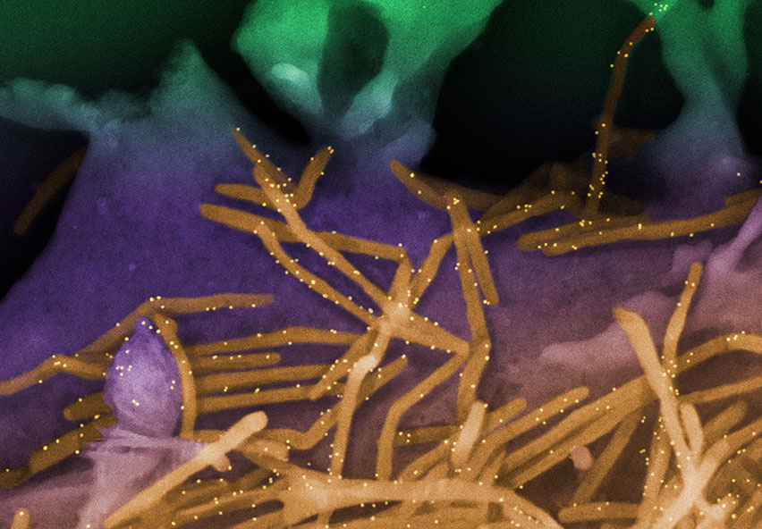 Farget elektronmikrografi av RS-viruspartikler i lungecelle. Foto: National Institutes Of Health / Science Photo Library / NTB