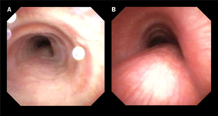Det viktigste diagnostiske verktøyet for diagnostisering av trakeobronkomalasi er fleksibel bronkoskopi (2, 4, 8, 9) . Undersøkelsen er dynamisk, hvor luftveiene inspiseres i tidal pust, forsert ekshalasjon og ved hoste (figur 1). Prosedyren krever narkose og anbefales ved betydelige symptomer, som persisterende, alvorlige og/eller gjentatte episoder med obstruktivitet uten respons på astmabehandling, eller hos barn med residiverende protrahert bakteriell bronkitt (11, 14) . Det finnes ikke standardiserte bronkoskopiprotokoller for malasi, og tolkningen vil være operatøravhengig (9, 15) . Oslo universitetssykehus utfører flest fleksible bronkoskopier på barn i Norge, og klassifiserer malasi som mild, moderat og alvorlig, som beskrevet over og i definisjonene fra European Respiratory Society (4) . Dersom kollabering kun observeres under hoste, og ikke i tidalpust, graderes malasien som mild, selv om symptombildet er alvorlig. Bronkoskopifunn vurderes sammen med kliniske symptomer. Utføring av fleksibel bronkoskopi hos barn krever spesialkompetanse. Tidligere ble trakeobronkografi brukt, men siden det benytter stråling og krever sedering, er det erstattet av bronkoskopi.
