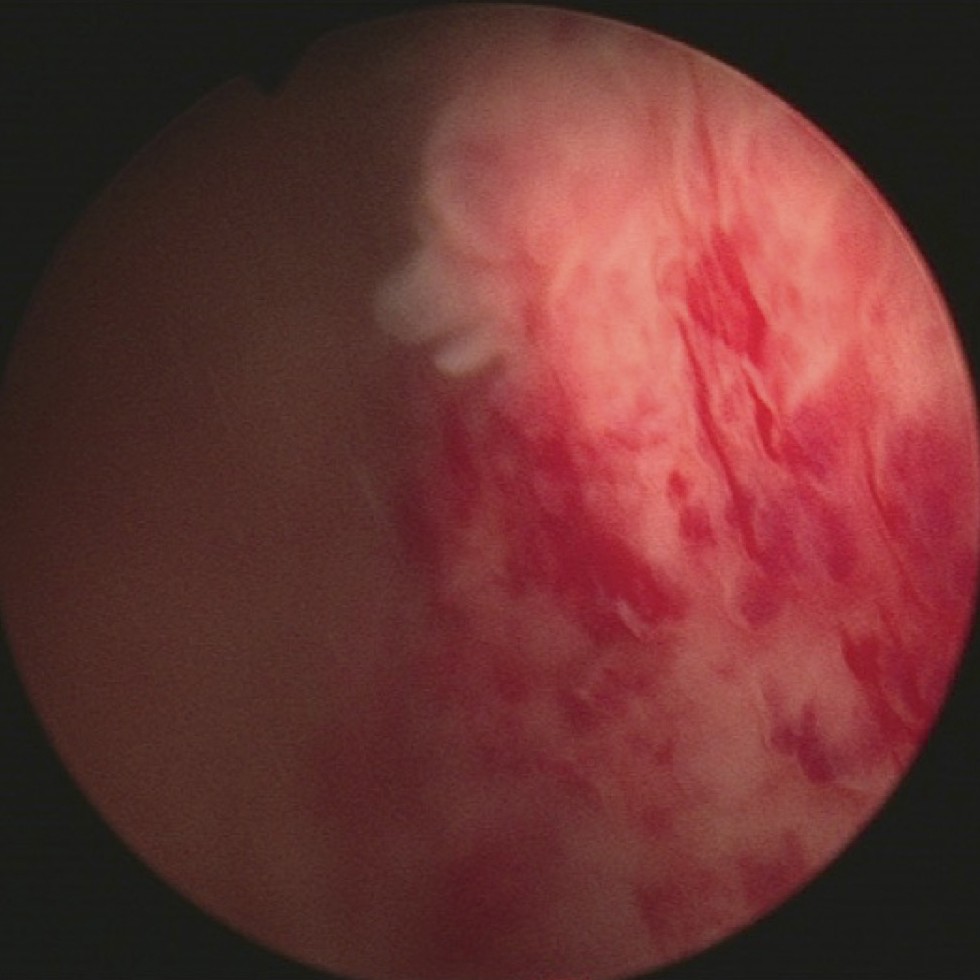 Cystoskopi viste generelt ødematøs og lettblødende blæreslimhinne, samt papillomatøse forandringer på venstre side i blæren (figur 2). Urincytologi viste enkelte irregulære/atypiske uroteliale celler klassifisert som Paris 3 etter The Paris System for Reporting Urinary Cytology (TPS). CT urinveier med kontrastvæske viste globalt veggfortykket blære, flere konkrementer i venstre nyre og et konkrement i venstre ureter med oppstrøms dilatasjon av samlesystemet. Pasienten ble avlastet med nefrostomikateter på venstre side før hun ble operert med transuretral reseksjon av de papillomatøse forandringene i blæren.