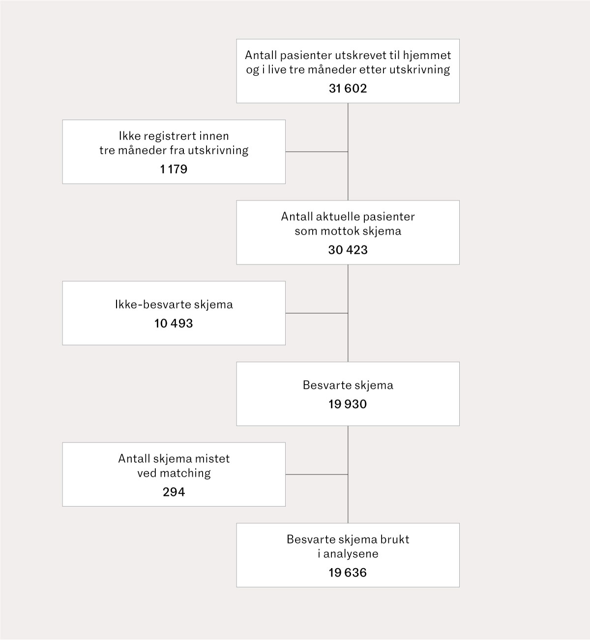 1 179/31 602 (3,7 %) ble ikke registrert innen fristen på 90 dager for å få tilsendt skjema. Av alle pasientene som oppfylte kriteriene for å få tilsendt skjemaet, var det 19 930/31 602 (63 %) som besvarte skjemaet (figur 1) Av disse var det 294 skjema som var ufullstendige og som ble ekskludert fra analysene.
