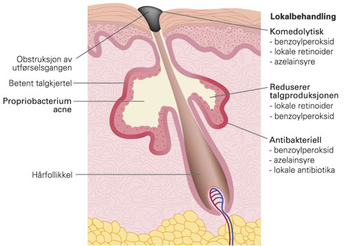 Acne vulgaris is a disease of the sebaceous glands. The condition is associated with sebaceous hypersecretion and is dependent on the sexual hormones testosterone and sex hormone-binding globulin (SHBG) (2). Abnormal cornification of the pilosebaceous canal is caused by increased proliferation or reduced shedding of keratinocytes, which cause the formation of a plug of sebum and keratin. The anaerobic, Gram positive microorganism Propionibacterium acnes proliferates in the anaerobic, lipid-rich environment caused by the increased production of sebum. A high production of sebum results in a higher concentration of P. acnes, although there is no correlation between the number of bacteria on the skin surface and the severity of the acne.