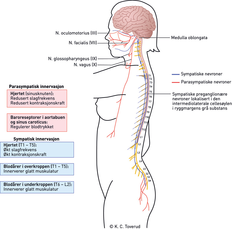 In the event of a complete cervical injury, the connection between the upper autonomic centres in the brain and the intermediolateral cell column at level T1–L2 of the spinal cord will be destroyed. Patients with cervical injuries have a higher risk of bradycardia (29 %), sudden unprovoked cardiac arrest (16 %) and conduction system disturbances, particularly in the first few weeks after the injury (5). Sudden death is not unusual either (6).