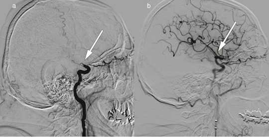 Patient 1. A man in his 70s was admitted with acute right-sided paralysis. The neurological outcome was scored on the National Institutes of Health Stroke Scale (NIHSS) to 21 points (severe cerebral infarction), and intravenous thrombolytic therapy was administered. The image to the left shows cerebral angiography with contrast injection in the left internal carotid artery, a) before and b) after embolectomy of a so-called T-occlusion (arrows) in the left carotid siphon and middle cerebral artery. The thrombus was removed and blood flow to the left hemisphere was restored 195 minutes after symptom onset. Further workup revealed atrial fibrillation and an embolic cerebral infarction in the middle cerebral artery territory. The patient received anticoagulation therapy with rivaroxaban. The NIHSS score was 0 points at follow-up three months later.