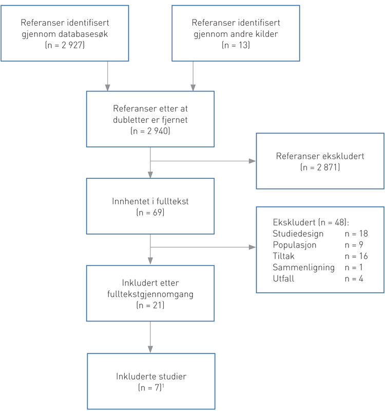 The search resulted in 2 940 titles and abstracts, which we evaluated against pre-defined selection criteria (Box 1). We included a total of seven randomised, controlled studies (Figure 1). One of the authors (LL) extracted data from the studies, while another (KGB) checked that the data retrieved were correct. The same two authors (LL and KGB) reviewed all the studies included and assessed the risk of bias in relation to patient selection, performance, detection, attrition and reporting (8). Randomisation procedure, blinding of participants and personnel, and analyses of attrition are important in this assessment.