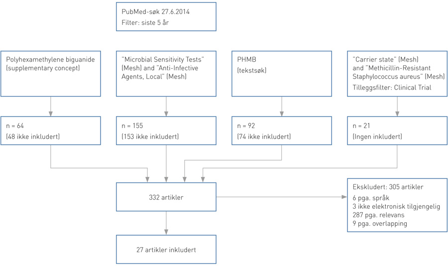 Review articles and original articles on antimicrobial efficacy in vitro, and clinical efficacy and safety for use on skin and mucosa were included, but case studies were excluded. We assessed their relevance based on title and/or abstract. Articles that primarily concerned the release of PHMB from various materials, the effect of surfactants, emulsions, presence of albumin and the efficacy of the dressing material itself were excluded. The results of these types of studies are frequently difficult to relate to the overall clinical efficacy, and we did not consider them essential in this context. We also excluded articles that were not available electronically, and articles on the treatment of acanthamoeba keratitis and on preservatives in contact lens solution to prevent this. Articles in English and the Scandinavian languages were included – a total of 27 articles.