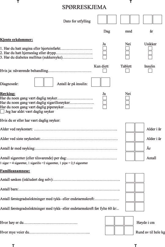 On arrival, all those who attended for colonoscopy screening in Arendal and Kristiansand completed a validated questionnaire on lifestyle and risk factors for colorectal cancer (24, 25). The one-page questionnaire contained four domains: height and weight, self-reported diagnoses, smoking and family history of colorectal cancer. We used the same questionnaire in our survey (e-Figure 1).