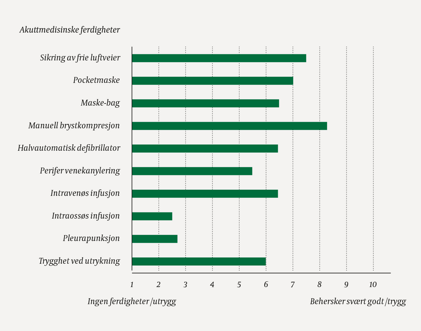 This small study cannot be used to compare medical schools or hospital internships, and the participants in the general practice internship undertook their earlier hospital internship in different health trusts. In this context, it is strange that the general training in teamwork that is imposed on local authorities and health trusts pursuant to the regulations concerning requirements for emergency medical services outside hospitals is rarely carried out (2).