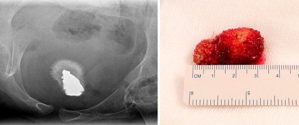 Examination revealed the boy to be in good general condition. A star-shaped scar was visible behind his left thigh, but there was no scar on the abdomen or perineum. He reported pain when supine, but his abdomen was soft. Ultrasound showed a foreign body at the base of the bladder. Pelvic x-ray examination led to suspicion of a large metal fragment in the bladder (image on left).