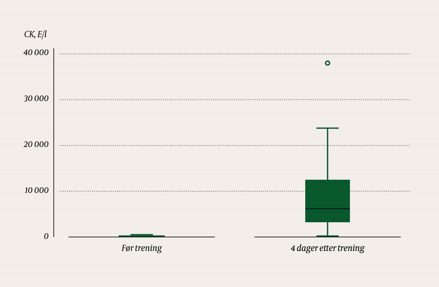 This experiment shows that intensive, varied exercise leads to a marked increase in CK levels, as previously demonstrated in studies using standardised exercise loads (12, 15). A marked increase in CK levels must thus be considered a normal phenomenon after an intensive workout. Moreover, we have shown that previous exercise history correlates negatively with the increase in CK levels. Since CK levels increased in all participants, there is reason to believe that most people with exercise-induced rhabdomyolysis are neither diagnosed nor treated in hospital.