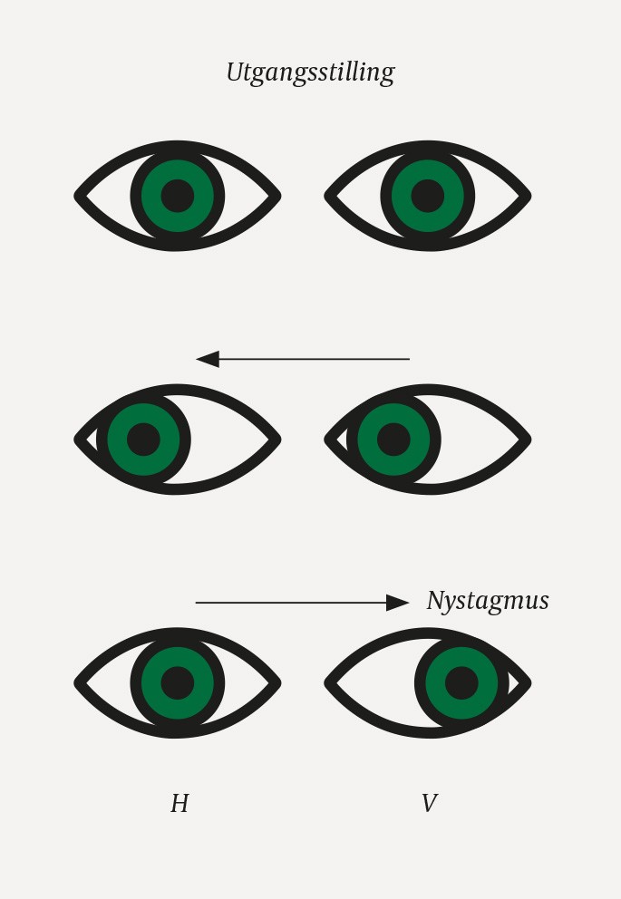 Saccades are rapid eye movements where the eyes shift focus from one object to another with a smooth, flowing and synchronous movement. Nystagmus refers to involuntary, rhythmic eye movements in association with a reduced ability to maintain fixation. When examining saccadic eye movements, the patient is asked to shift his or her gaze to the side from one object to another (Box 1 ). In saccadic dysmetria, the patient's gaze overshoots or undershoots the target object. The patient's eyes typically make corrective movements back and forth before finally managing to fixate the object.