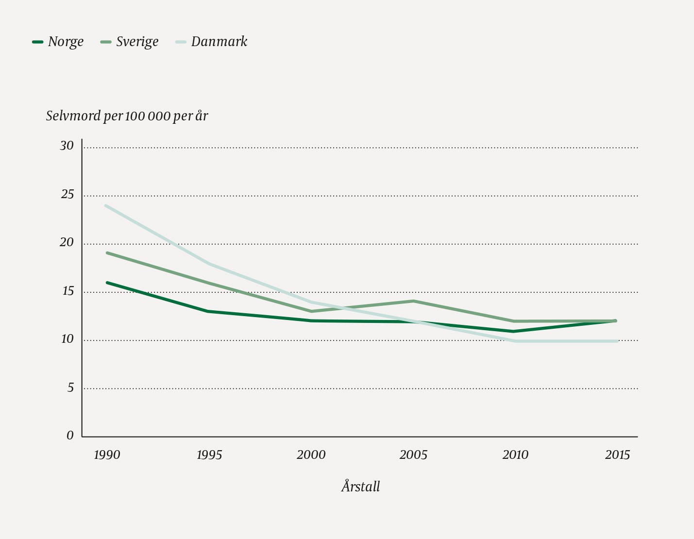 3. Folkehelseinstituttet. Selvmord i Norge. Oppdatert 15.12.2017. Lest 18.7.2019. https://www.fhi.no/nettpub/hin/psykisk-helse/selvmord-i-norge/#fylkesforskjeller.