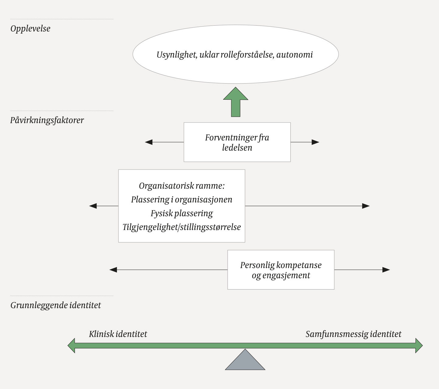 Studies on hybridity show that an emphasis on clinical identity may delay the development of an administrative identity, thereby adversely affecting role performance (7), (10–12). Various motivational theories show that we are attracted to tasks that engage our skillset and give us a sense of mastery (7, 10). Local authorities should therefore seek to prioritise the development of a public health identity for the role of District Medical Officer, to enhance role performance. This will require organisational contexts and expectations to encourage public health work efforts on a variety of levels in different municipal sectors. If the contexts primarily promote the clinical identity, this may obstruct the development of a public health identity, heighten the sense of being invisible and increase role uncertainty. Figure 1 shows the relationship between the basic identities, the influencing factors and role perception.